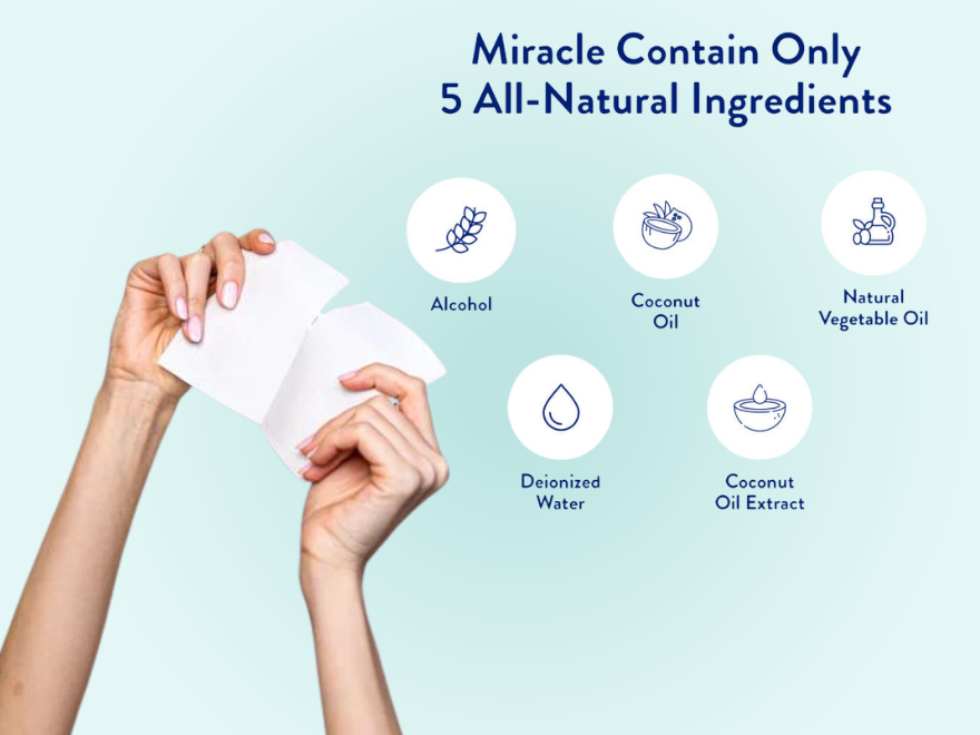 Our all-natural, vegan, and cruelty-free ingredients are: Coconut oil, alcohol, natural vegetable oil, coconut oil extract, deionized water.